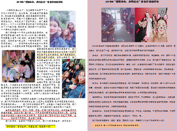 本次活动,以“感悟生命,共同成长——生命教育与宿舍同行”为主题面向全院在校生征集作品。征集作品包含宿舍所有成员和宿舍环境的全景照,入校以来生命成长过程中的收获,以及有关珍惜生命的宿舍宣言。此次活动共收到130份作品。经过评审,最终评选出18件获奖作品,其中,一等奖作品4件,二等奖作品6件,三等奖作品8件。